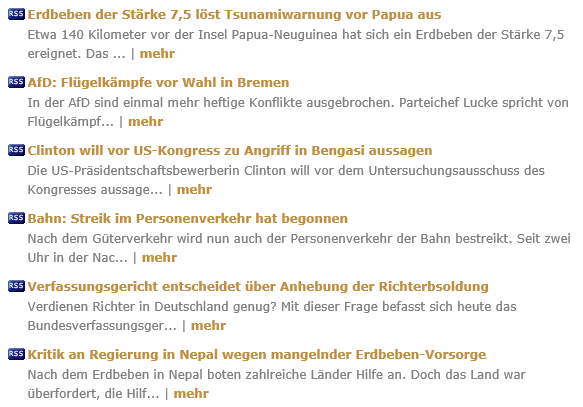 Ich habe einen externen RSS-Feed mit Nachrichten aus der Region eingebunden. Aktuell werden so auf meiner Seite die Überschrift der Nachricht und der komplette Text angezeigt, da ich im Plugin das Häkchen "Kurztexte anzeigen, wenn verfügbar" gesetzt habe. Klickt der Leser auf die Überschrift der Nachricht landet er auf der Website des Publishers, ansonsten bleibt er bei mir.