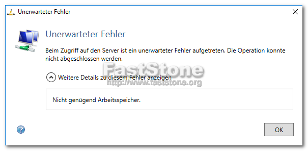 ich wollte im meinem Projekt eine Grafik (963kb) austauschen. Leider ist das nicht möglich. Nachdem ich die Grafik ausgewählt habe, bekomme ich seit heute immer folgende Fehlermeldung. Ein Neustart meines Rechner, bzw. die Überprüfung des lokales Arbeitsspeichers blieb erfolglos. Hier ist soweit alles OK. Warauf deutet der Fehler hin?